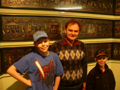 So if you’re in the knitting business, at some point in the process of turning wool into a sweater you will need to take a large, washer-like disk of steel and punch little notches into its outer rim, for some use in the process which I do not know. You will gradually collect a zillion little bits of steel, each measuring about two by three millimeters, unless you are so stupid as to throw them away. Then you will take these bits of steel and stick them onto the business side of a big roll of masking tape, creating a steel mosaic. But the yellow masking tape will show itself between the gaps, so you will rub black shoe polish over the whole thing to turn the tape black but leave the steel shiny. You’ll do this until your mosaic reaches, oh I don’t know, 34 meters long. Then you’ll take a tiny paint brush and some paint (of course) and commence to recreate the Bayeux Tapestry, an 11th or 12th-century tapestry depicting the battle of Hastings in 1066. It should take 20 years or so, if you also decide to invent yourself the last quarter of the tapestry which has gone missing over the intervening centuries.